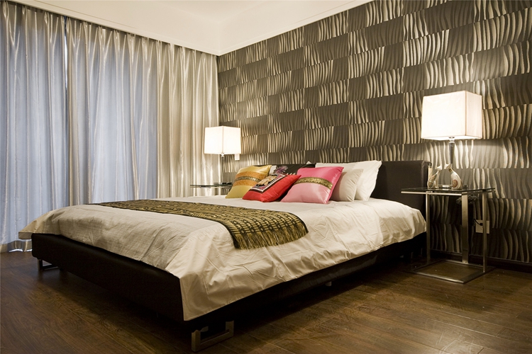 紫苹果别墅装饰公司设计师陆老师提醒大家卧室的设计无论是何种风格都是以实用性和温馨感为主。该卧室的床头背景墙是个别具匠心的设计,看似硬朗的波纹状图案其实是软包背景墙,一方面避免了新中式卧室常有的沉闷感,另一方面为空间增加了舒适性,浅黄色透绿的色彩为整个空间入住了几分生机,简约的布局和装饰让人安静地享受着静谧的时光,感受着家的乐趣与美好,安然睡去。