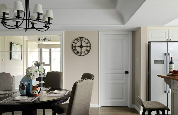 客厅的一旁便是餐厅,整个布局采用开放式的设计,视野上更加开阔,让整个空间看起来更加通透,同时方便了家人的生活起居。没有过多的装饰,美式经典的铁艺吊灯造型别致,洒下的灯光照在围坐在一起聚餐的家人脸上,仿佛看到了脸上洋溢着的幸福的笑容。