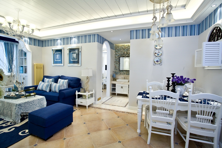 紫苹果别墅装修公司设计师陈老师在设计该案例时,采用地中海风格常用的天蓝与海鸥白色调装饰整个空间,无论是深蓝的沙发布艺和地毯,还是蓝白花纹的壁纸,整个搭配看上去很随意,小编看着都毫无抵抗力。沙发慵懒舒适的造型加上蓝白条纹相间的枕套,多了几分温馨舒适的感觉,更有了家的味道。