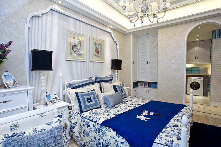 这是一个次卧,之所以把次卧拿出来讲是因为它融合了更多地中海风格的设计元素。最显眼的是床幔的设计,垂下来的床幔就像是婀娜的少女,温柔而又自然。原木材质的地板带来的原生态的质感弥补了地中海风格会让人感觉过度清新范的矛盾。住在这样的房子里,每天回到家都会感受到扑面而来的幸福感。这样高颜值还有情调的家,让我不吃不喝也愿意,就这么傲娇!