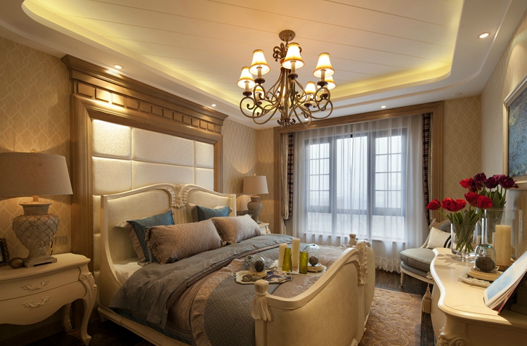 主卧依然采用的是比较温暖的色彩装饰,暖黄色的色调在金色背景的映衬下更加凸显别致。精致素雅的床品与软包设计的床头背景墙体现了卧室对舒适性设计的要求。薄纱窗帘的装饰让阳光可以自由地洒进室内,躺在床上享受着午后的阳光,试问还有比这更惬意的生活吗,想想都让人羡慕。