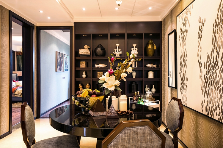 紫苹果别墅设计公司设计师陆老师在设计该餐厅时更加注重家居功能性和实用性,充分业主的生活习惯,采用开放式的布局让整个空间在视觉效果上看起来更加开阔,同时合理地利用了空间。由传统中式博古架改良的餐边储物柜,摆放着具有美好寓意的中国风装饰品,寄托了设计师对业主的美好祝福,每个细节彰显着别致的优雅与精致,同时彰显着设计师的良苦用心,一切都“美”的刚刚好,恰到好处。每一个细节都彰显着无尽的优雅与精致,一切都“美”得刚刚好。