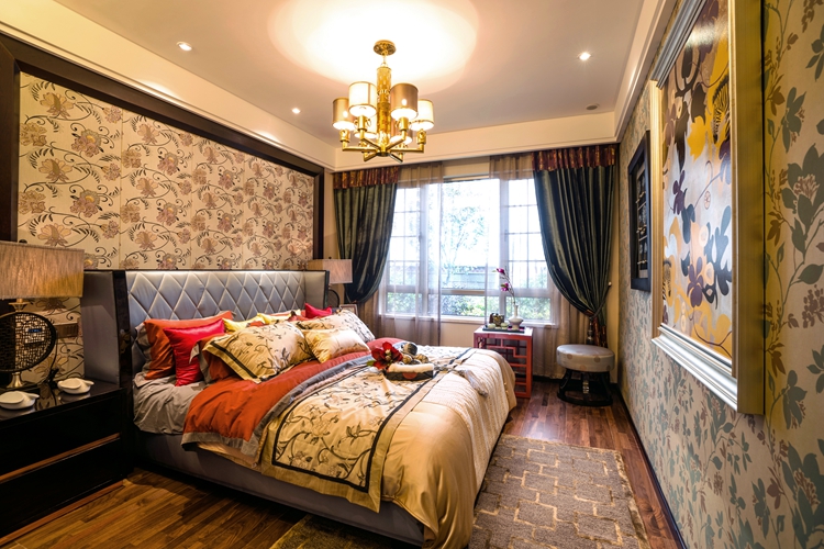 卧室的设计利用色彩与材质将精致细腻、优雅华丽的气质彰显无余。高贵的气质洋溢在房间的每个角落。丝绸般顺滑的床品与田园风情碎花元素的壁纸,营造出浪漫温馨的生活气息。虽然说卧室更多的是强调功能性,但也要设计的有情调,有格调,也要展现“美”的一面。从色调上来看看似浓墨重彩,实则简单大方,没有过多的装饰,轻描淡写,让人细细体会含蓄而不保守不可抗拒的中式魅力。