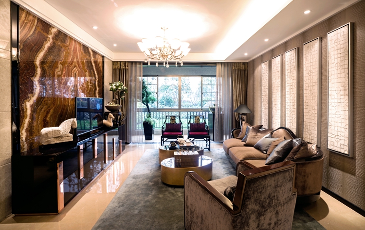 紫苹果别墅装修公司设计师陆老师擅长新中式风格的设计,在设计该案例时对地面的设计极为考究,用奶茶色大理石瓷砖与整体的温暖氛围和谐搭配,同时灰色的地毯与沙发布艺色调保持一致。这样既避免了空间的冷硬,又使空间增添了几分和谐自然。在选材上,大理石光洁透亮硬朗的质感,与木质家具的粗狂简单完美协调,现代的时尚与实用性得到实现。落地窗的设计把美丽的室外景色尽收眼底,在阳台就可以沐浴温暖的阳光,这样的生活谁能不羡慕呢?