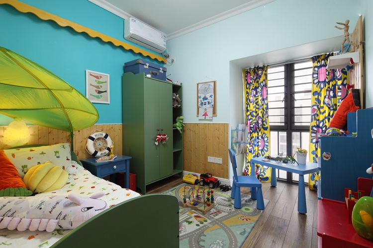考虑到业主家有一对双胞胎宝宝,所以特别设立了一个儿童活动空间,而且整个布局和家具的摆放让整个空间并不感拥挤。各种鲜艳的色彩组合在一起,符合小孩子爱玩的天性,激发儿童的想象力,让孩子从小就拥有自己的空间快乐成长。