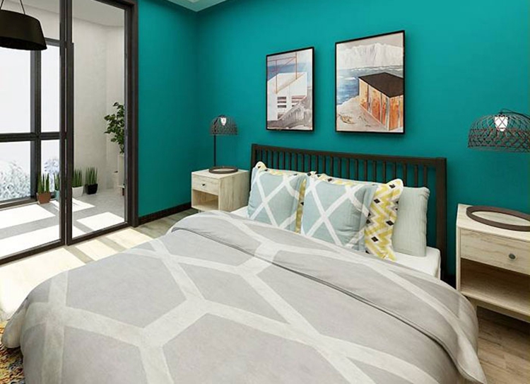 在设计卧室时,紫苹果别墅装饰公司设计师陈老师考虑到卧室的功能性和温馨感,以及现实户型不算大的实际情况,将阳台和卧室打通设计,在视觉效果上看上去更加开阔,同时保证了室内充足的光线,通透敞亮。简洁干净中透出别样的风情,墨绿色的床头背景墙展现的现代时尚的大气高端和年轻人的蓬勃朝气。通透明媚中,随处都是阳光的自然味道。
