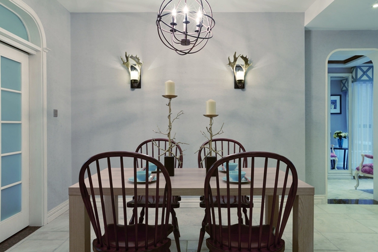紫苹果别墅设计公司设计师曾老师在设计餐厅时考虑的是听过精致的餐桌椅家具等装饰来营造一个素雅温馨的就餐氛围。无论是造型别致的餐椅还是原木材质的素雅餐桌,抑或是造型别致的铁艺吊灯搭配烛台造型的灯泡,垂下的灯光映在家人的脸上,十足的幸福感洋溢在脸上,营造了一家人在青青湖水边用餐的和谐氛围。