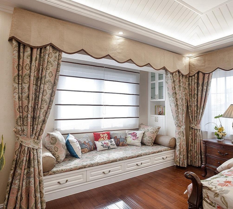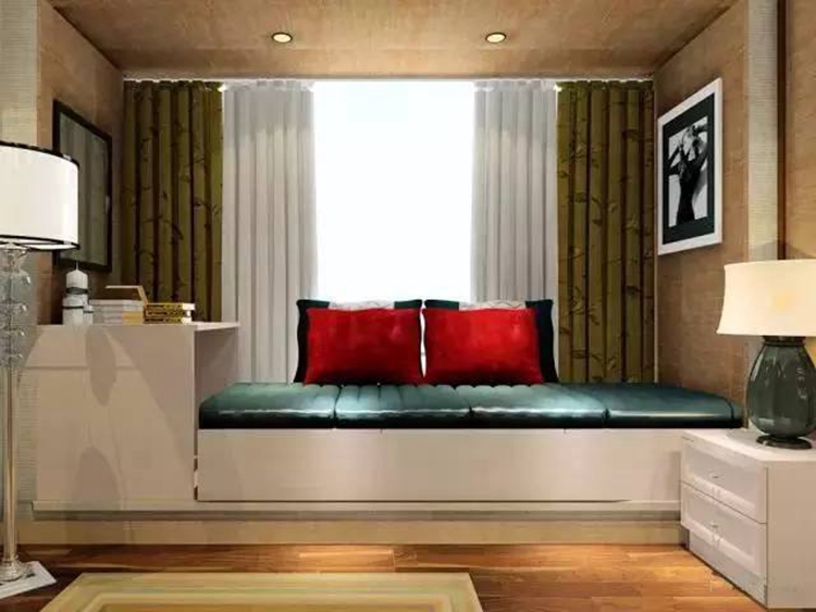 卧室+飘窗的设计,利用靠窗采光好的优势,不妨将飘窗设计为一个小床可供小憩一会。田园风碎花图案的窗帘,素雅的窗帘,米白色的家具,搭配整体古典风格的家具,绿意尽显,倚在墙边沐浴着阳光,让窗外的绿意拂去一身的倦气。光是色彩就足够征服小清新的了,简单粗暴的一字型床具,榻榻米下面多个抽屉的组合,实现的置物功能与工作都是极好的。