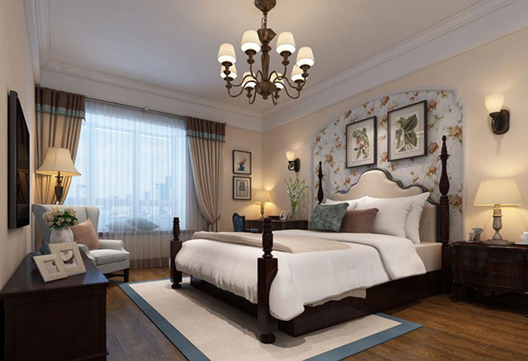 卧室的软装配饰是一大亮点,紫苹果软装设计师夏老师更多的是通过美式田园风格的风格来搭配软装配饰,简化了美式风格的繁琐,透露着田园风格的优雅。无论是精致的铁艺吊灯抑或是田园风碎花图案的床头背景墙壁纸,柔美雅致,温馨可人的气质由此打造而成。飘窗的巧妙设计又为整个空间增加了几分灵性与别样的情调。