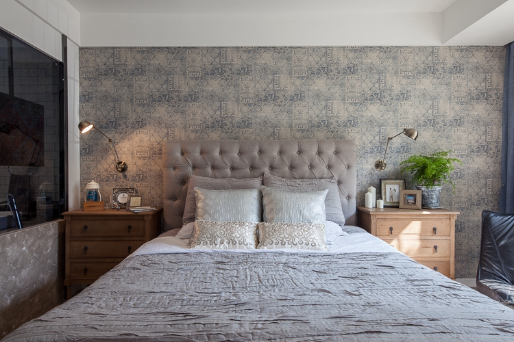 卧室的设计讲究从简,无论是家具的陈列或者是软装装饰,卧室需要营造的是静谧的氛围,避免过于繁杂的设计。灰色的棉质床品与淡雅蓝白相间的床头背景墙,素雅别致。两个原木材质的床头柜分列两边,整体布局采用的是常用的对称手法,走进卧室就给人一种整洁舒适的感觉,达到超出想象的效果,让人在如此有格调的环境中沉沉睡去。