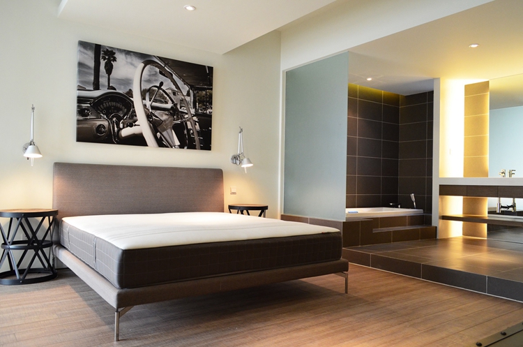 紫苹果别墅装饰公司设计师陈老师在设计卧室时更多的是效仿了酒店式公寓常用的设计理念,将卫浴空间与卧室半掩开来,看似在一个空间,其实通过推拉门和隔断将两个功能不同的空间相互隔开,保证了每个空间的独立性和私密性。整个空间采光良好,阳光照在墙上,简单的黑白画,与白墙一搭,毫无违和感。