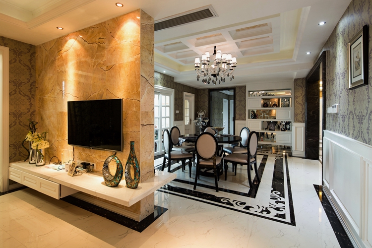 紫苹果别墅装修公司设计师胡老师在设计餐厅区域时,通过大理石电视背景墙将客厅与餐厅相隔开来,大理石天然的质感为整个空间增添了几分大气与硬朗。餐厅与客厅半开放的布局设计让两个功能不同的空间保证了各自的私密性和独立性,电视背景墙既充当了隔断的作用又是两个空间的背景装饰,这种一举两得的巧妙设计体现了设计师的专业与奇思妙想。
