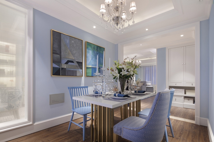 餐厅的设计采用半开放的设计,虽然看似在两个不同的空间,但是并没有明显的隔断,在视觉上给人无障碍的感觉。湖蓝色与白色色调的交融营造了一个温馨浪漫的就餐环境,同时浅色系的配色不会给人拥挤的感觉,湖蓝色的电视背景墙漆粉刷,电视柜做成到顶的收纳柜,浅色系的配色避免了拥挤的视觉。虽然色彩上并不是传统美式的古典风,但是造型舒适的家具与鲜艳的盆花还是给人营造出自然随意的氛围,试想一家人围坐于此就餐的浪漫情景,甚是幸福。