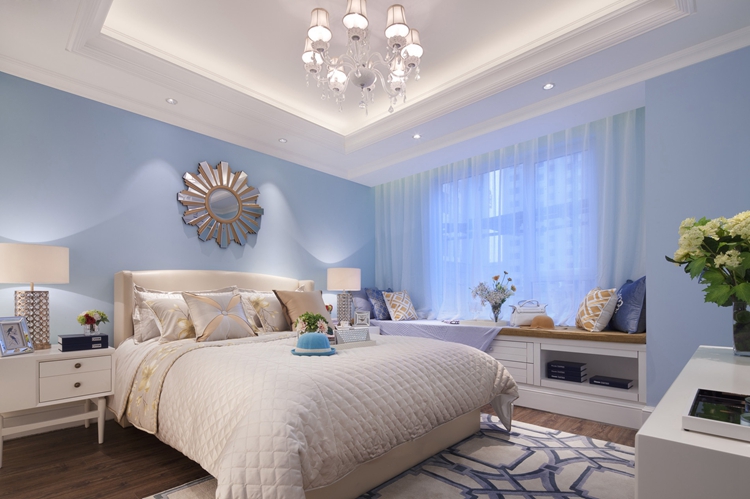 紫苹果别墅设计公司设计师在设计卧室时,在色彩上保持乐整个空间色彩搭配的协调统一,毫无跳跃感。层叠造型的吊顶,层次感十足,给人利落清爽的感觉。飘窗的设计是一大亮点,既可以倚墙小憩,也可以收纳储物。薄纱窗帘既保证了卧室的私密性和隐蔽性也透着几分神秘、静谧、浪漫,不失精致与温和。