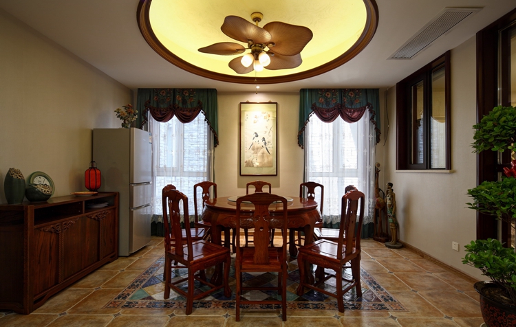 之前《舌尖上的中国》火的一塌糊涂因为中国有几千年的饮食文化源远流长。中国人讲究团圆,期盼着一家人围坐在一起聚餐享用美食。紫苹果别墅装修公司设计师黄老师在设计该餐厅空间时采用的传统中式常用的圆形餐桌,寓意团圆。红木家具等传统中式常用的设计元素与现代化的简约空间设计,散发着浓郁的中国美。岁月静好,任它冬去春来,只要有家人的陪伴就好。