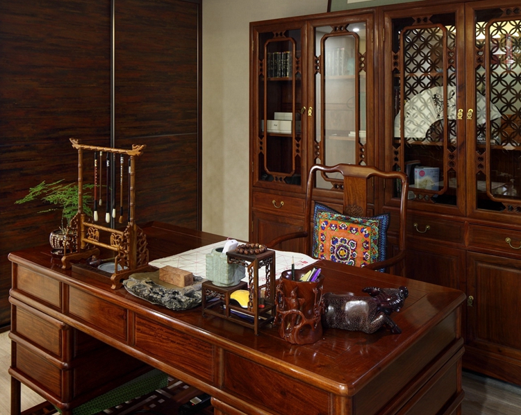 在中式和新中式设计中,书房是不可忽略的空间之一。置身该案例中的书房中,仿佛自己化身为古代的文人墨客,或挥毫泼墨、或文思泉涌,伴着沉香的香气,沉淀心灵,感受那一份沉静与悠然。精雕细刻的红木家具让人感受到的是匠人精神的传承,整个空间都充满书香的香气,让居住者感受到喧嚣世界难有的闲适。