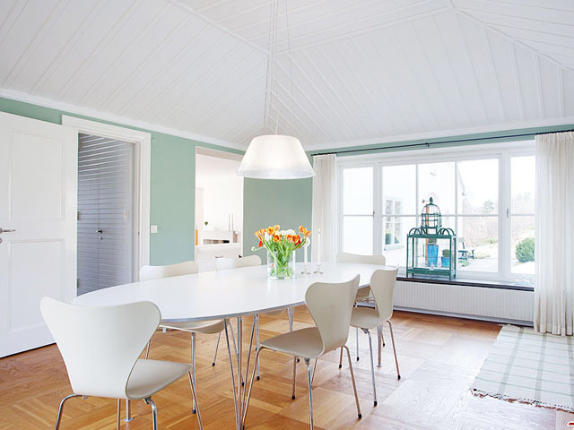 紫苹果别墅设计公司设计师曾老师设计的餐厅,开放式的布局宽敞明亮,白色简约素雅的装饰,造型简单别致的餐椅虽然看上去个性不显实用,但是一切都是符合人体工程力学的设计。原木地板的搭配自身的北欧原木风让整个空间多了几分大自然原生态的气息。干净明澈的设计具有一种静态感,让人回归本真,回归纯粹。