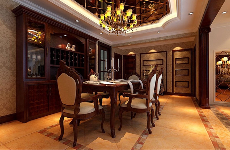 餐厅设计有没有让你回忆起《美女与野兽》电影里城堡内善良的人们为贝尔做的第一顿丰盛的晚餐。长方形的餐桌更加的舒适、自然,可以容纳更多的亲朋好友聚在一起享用美食,营造的是幸福美满的生活空间。餐边柜的摆设可以充当酒柜的角色,让整个空间更加丰富,同时增加了空间的实用性与功能性。精致典雅的吊灯发出暖黄色的灯光照在亲人朋友的梁上,脸上洋溢着幸福的笑容,倍感温暖。