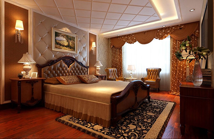 卧室沿袭其他空间的金黄色色调,但是在灯光上避免了光线过亮,微弱的灯光营造出更适宜休息的睡眠空间。除了色调给人的奢华的感觉,在装饰上并没有采用特别浓厚的华丽装饰,精致的窗幔与舒适的软包床头背景墙,各种实木家具,完美地搭配在一起,和谐自然而又动感,华丽而不做作,大气而不张扬。