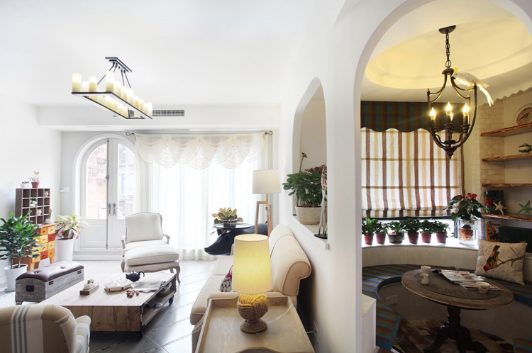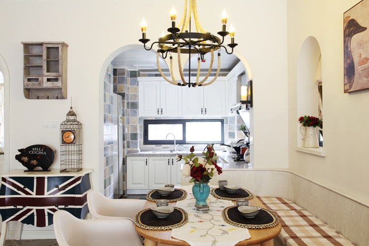 蜡烛灯、鸟窝灯、缠线灯、鸟笼钟、手绘海图、做旧地砖、榉木拉杆绳索、鹿角以及各种鸟类的挂画等细节的搭配都让整个房间呈现出童话世界般的瑰丽色彩。餐厅+厨房开放式的布局让整个空间变得更加的开阔透亮,既方便了家人的生活,同时在视觉效果上看上去更加开阔,透过敞开的门廊、窗洞、幸福的味道洋溢在整个房间。