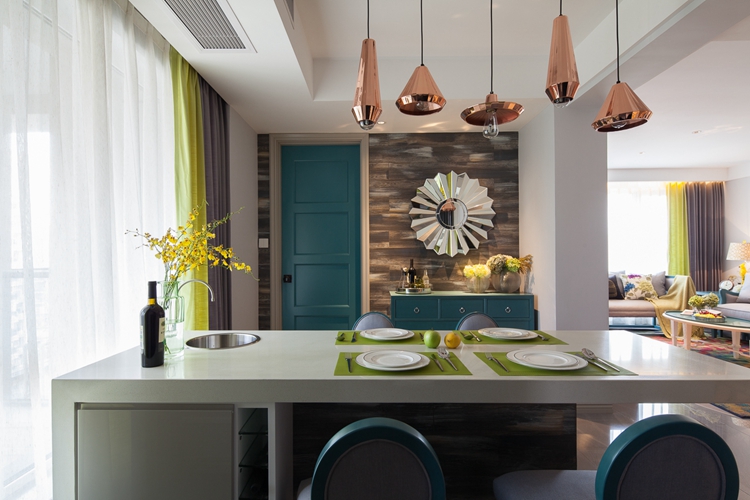 春天到了,不只有鲜艳的桃花,更有满目的新绿。绿色在家居设计中能让人感到放松、惬意,就像是该案例中的餐厅。虽然没有天然绿植的点缀,但是一抹灵动的绿色盘托为整个洁净利落的餐厅增添了几分活力,同样是开放式的设计,黄色的鲜花作为呼应,相辅相成,共同营造出一个轻松舒适的就餐空间,吃饭也变成了一种情怀。