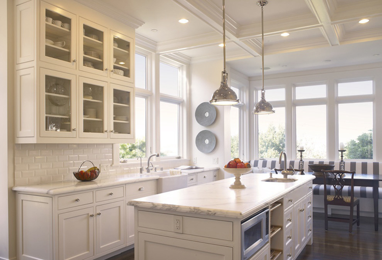灯光布置方面,厨房灯光需分成两个层次:一个是对整个厨房的照明,一个是对洗涤、准备、操作的照明。后者一般在吊柜下部布置局部灯光,设置方便的开关装置,还有性能良好的抽油烟机一般也有灯光,对烹饪来说是足够了。