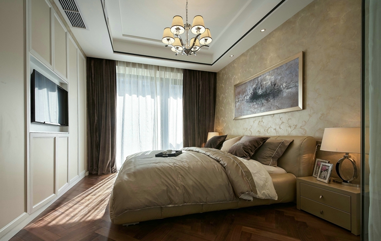 卧室空间的设计只能用“利落”来形容,没有繁杂的装饰,无论是色彩的搭配还是简洁的家具,整体给人感觉舒适舒心。层次感分明的吊顶,避免了视觉上的单薄印象。华丽高贵的床具造型慵懒,搭配深色木地板,让整个空间更加温馨袭人。简洁的设计让你在需要独处的时候给你留出空余的自由空间,带给你家的那份灵动与婉约。