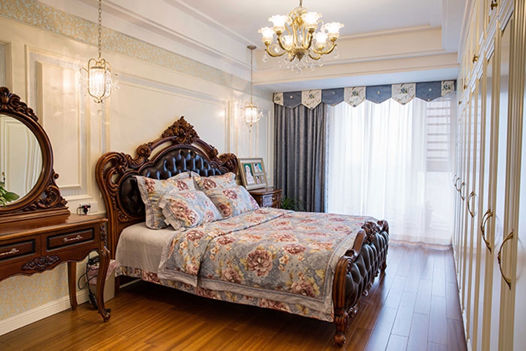 紫苹果别墅装修公司设计师陆老师提倡设计以人为本,空间的色彩与整体色调一致,古典色的设计和流苏丝绸般顺滑的窗帘,使整个空间充满灵动、活泼。舒适的储物空间加上品牌床具一切是那么的随意又不失尊贵。暖黄色调的床头墙软包设计和台灯散发出来的暖黄灯光,活泼生动,温馨自然。