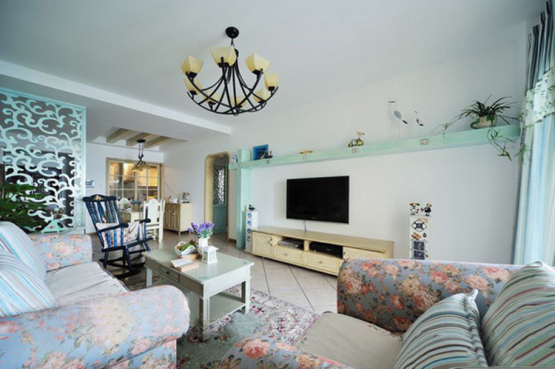 客厅的装修设计,浪漫的地中海风情洋溢在每个角落,整体设计甜美可人。沙发背景墙采用田园风格的壁纸装饰,与之呼应的是田园风格的碎花沙发布艺,浓浓的地中海浪漫气息中渗透着田园风的休闲与舒适。电视背景墙采用乳白色乳胶漆装饰,没有过多的装饰,简单大方。落地窗的设计让阳光尽情地洒进来,整个空间看起来敞亮多了。