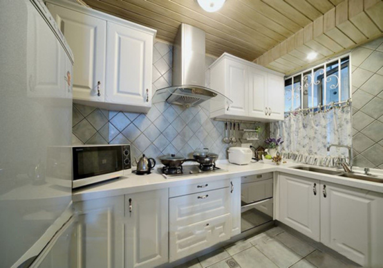 厨房设计采用传统的“L”造型设计,这样更加方便在这个不算大的空间里活动,为家人做一道美味的佳肴。象牙白橱柜和错综有序的菱形瓷砖拼贴,为整个空间增添了几分舒适。