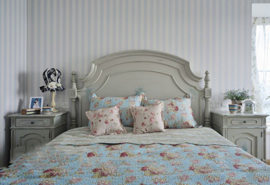 卧室的设计没有过多的装饰,简单精致。灰白色调的床具和田园碎花图案的床品搭配,素雅风十足。海魂风蓝白条纹相间的壁纸颇具年代感,让人回到了80年代青葱岁月。