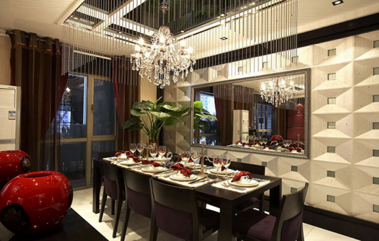 餐厅的设计在色调的搭配选择上比较温馨浪漫,注重了空间色彩的搭配,无论是暖黄色的立体瓷砖还是餐桌旁的红色个性座椅,让客厅突显舒朗阔绰的空间感,长方形的餐桌让一家人聚集于此就餐,适合亲子间享受天伦之乐的美好时光。水晶灯发出的blingbling的灯光的明朗而饱满,烘托和渲染了整个空间的气氛。