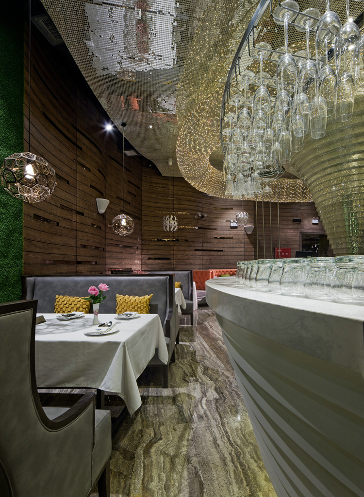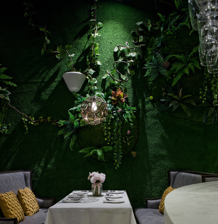 服务台同样为弧形,与顶面、墙面相呼应,成波浪形,宛如白色丝带在空中飞舞,柔软,光滑。本案在软装方面,运用了大量彩色,使得整个空间动感十足。蓝色的模特灯,粉红的餐椅,无一不透漏着时尚的俏皮感。右面为包厢,包间使用米灰色墙面,顶面为镜面马赛克,让空间沉静如秋水,加上软装饰用色的搭配,增添了许多跳跃感,壁炉的火焰,瞬间感到温暖的气息。向里走进过道,绿色植物从左侧墙面的林木间长出,一呼一吸都是清新的空气。植物这里尽情的舒展生长。