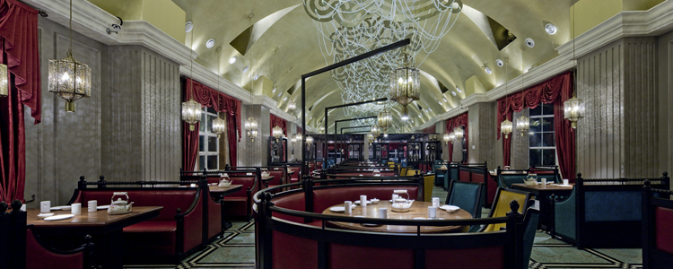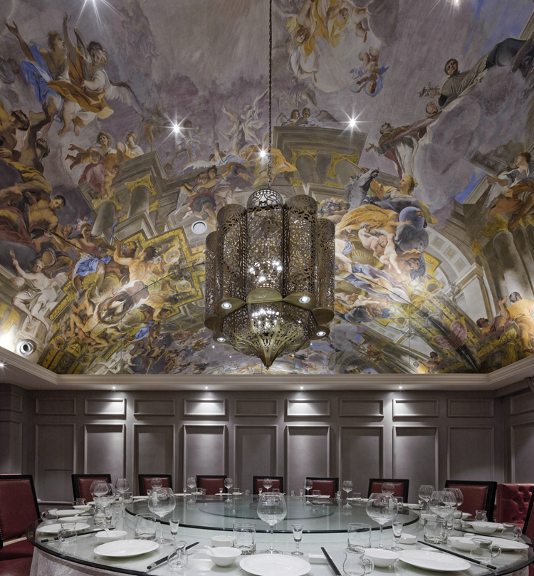 二楼大厅为挑高空间,6米高的拱顶,被贴以金箔,投以灯光,瞬间将你拉回十三世纪文艺复兴时期,高大的穹顶庄重威严,让人肃然起敬。顶部一片云朵贯穿整个大厅,装点缀酒红色、黄色、蓝色让整个空间重回时尚。二楼散座区,顶部为蓝色与黑色结合的八边造型吊顶,静谧幽蓝的光,增加了神秘感,越发的引人入胜。