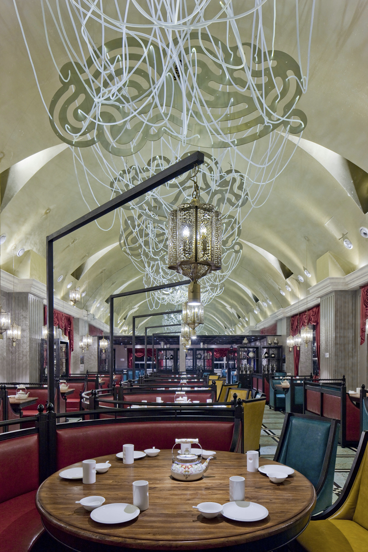 基于建筑空间尺度的充足,设计师改变了原有的建筑形式,改造出一个夹层。顺楼梯而上,迎面而来的是一面大小不一的壁龛,透过壁龛的光,我仿佛听到了楼兰美女银铃般的笑语。顺着走廊,来到大包间,6米高的拱顶绘制民族风情画,墙面的画卷与之呼应,如史诗般缓缓铺开,动人的故事,娓娓道来。