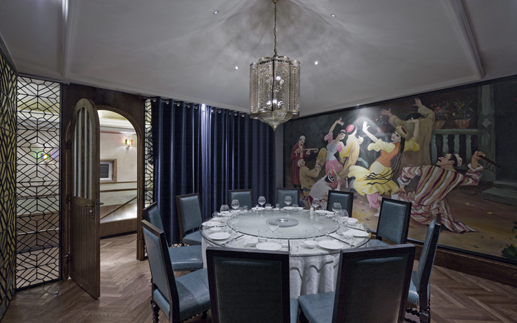 卫生间地面铺以花砖,墙面为鹅卵石,拙朴的气息,仿佛置身楼兰古国。包厢延续了整体的设计手法,以灰色为基调,配以彩色的餐椅,酒红色窗帘,不招摇,不谄媚,宁静致远。连包的隔断依旧使用黑色钢艺雕花,四面拱顶造型,尤为独特。银质吊灯的光影散落在餐桌上,造就另一道风景。