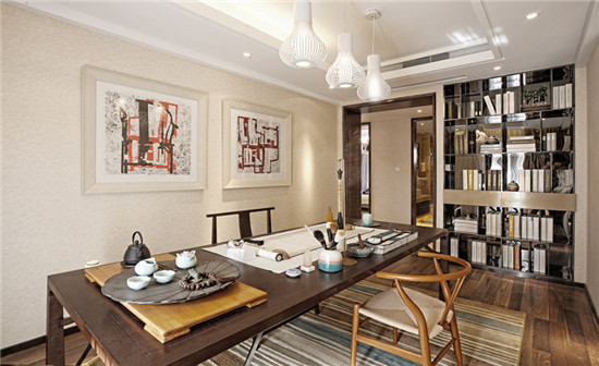 古色古香的书房、复古考究的的书桌、椅,编织造型的吊灯,结合了传统的竹条编织的吊灯造型,但是新型材料让其具备现代风格的简约、时尚。设计师精心的陈列,包容而又精简的手法,将传统中国风元素和现代风格的时尚气息融合于空间的每一处。