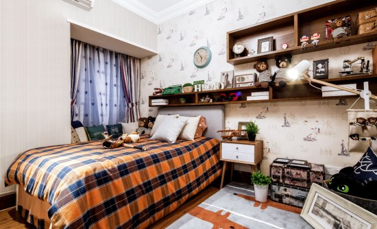 在小型卧室的装修中,设计师注重对于房屋面积的充分利用以及全方位的使用。卧室选用墙上书柜的形式节约房间面积,加上收纳盒的使用使得房间面积可以得到充分的利用。而因为房间采光方面的欠缺,故而在颜色的选择上选用色彩明亮的橙色,提高房间的明亮度以及增添房间的活力与热情。