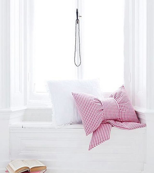 整个空间呈现白色,同样是在窗户下方的位置特意留出了一个小坐台的空间,小飘窗就这样打造出来了。点缀其间的粉色条纹抱枕让这个角落瞬间变得可爱起来。