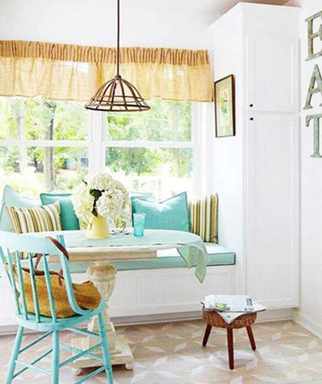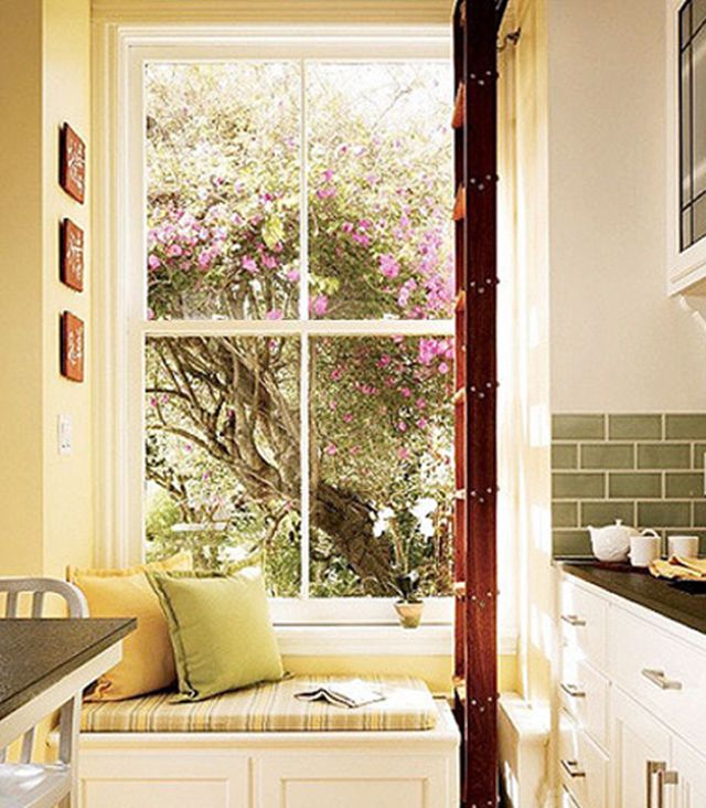厨房中肯定也会有利用不到的小角落,那么不妨学学上图构建一个小飘窗,放上可以收纳的小柜子,这样就很好的将这样一个1㎡的空间利用起来了,在吃饭、烹饪的同时还能有不错的休息看风景空间。