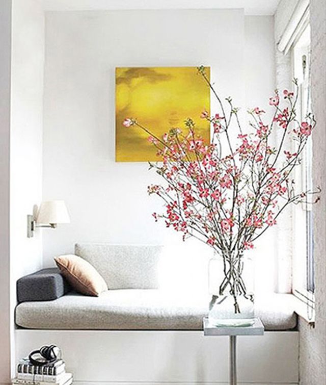 走道尽头的空间完全被飘窗填满,提供了很好的休息放松空间,长度足够,可容纳下一人自由躺卧。而整个角落比较出彩的应该是前方的插花装饰了,生机勃勃很有活力。