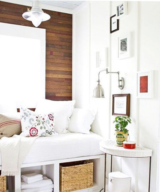 虽然同样是比较小的飘窗空间设计,但是主人明显在设计时将收纳问题考虑进去了,整个飘窗下方就被打造成收纳格的样式,很好的提供了放置杂物的空间。