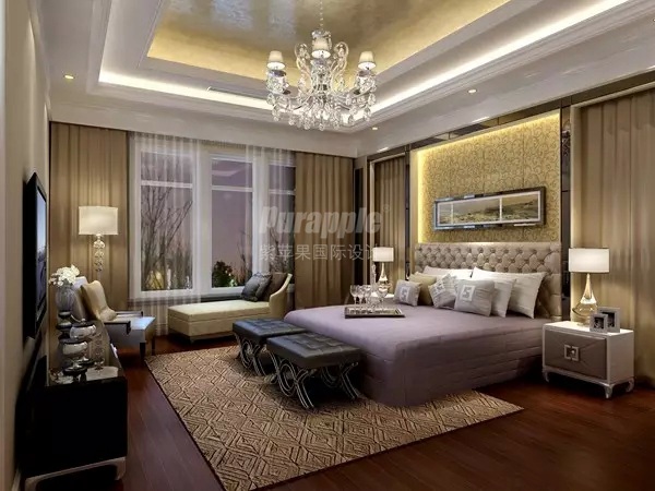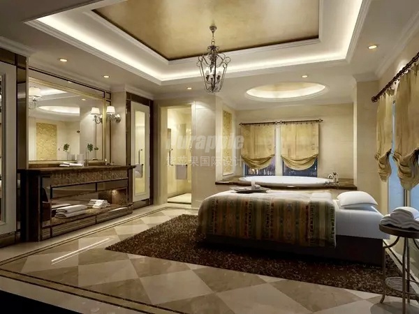 卧室空间:整体色彩,壁纸风格及地毯的古典端庄风味,与床品,窗帘,及家具的现代浪漫气息相融合,兼容华贵典雅与时尚现代,反映出现代个性化的美学观点和文化品位。
