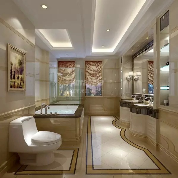 卫浴空间:空间以黄色,白色,黑色为主,大面积浅色大理石,让空间呈现一脉奢华,优美华丽的特色。墙上的装饰画,金色窗帘,为空间营造了古典文化气质。