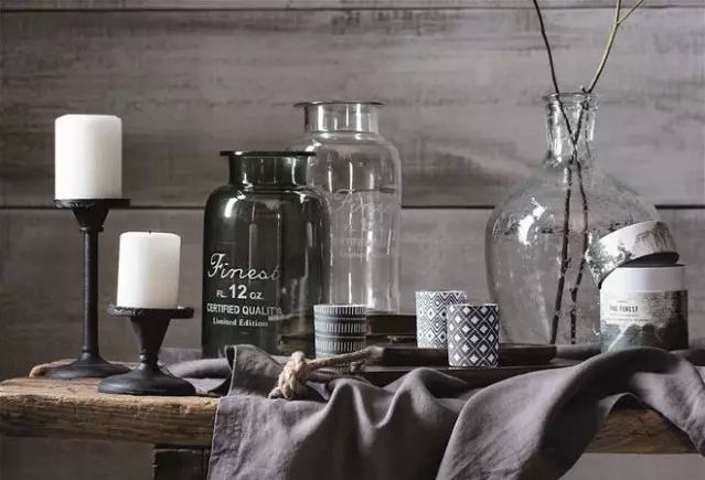 玻璃和铁艺是复古设计里最默契的搭配。铸铁烛台与各种造型的玻璃装饰组合在一起,营造出了一个带感又温情的情趣小角落。花瓶里的枯枝和棉麻桌布很好地呼应了岁月感的主题。