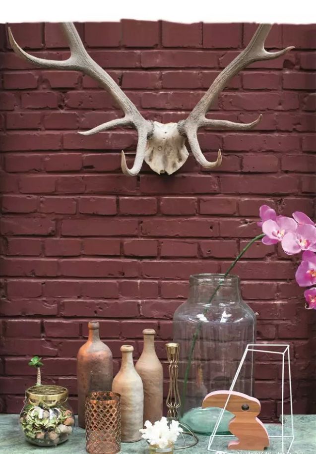 大红色的砖墙和淡绿的大理石台面的搭配十分大胆,墙面上的鹿角把整个画面衬托得很有复古格调。各种新与旧的台面装饰让这个落寞的餐边角落变得充满摩登格调。