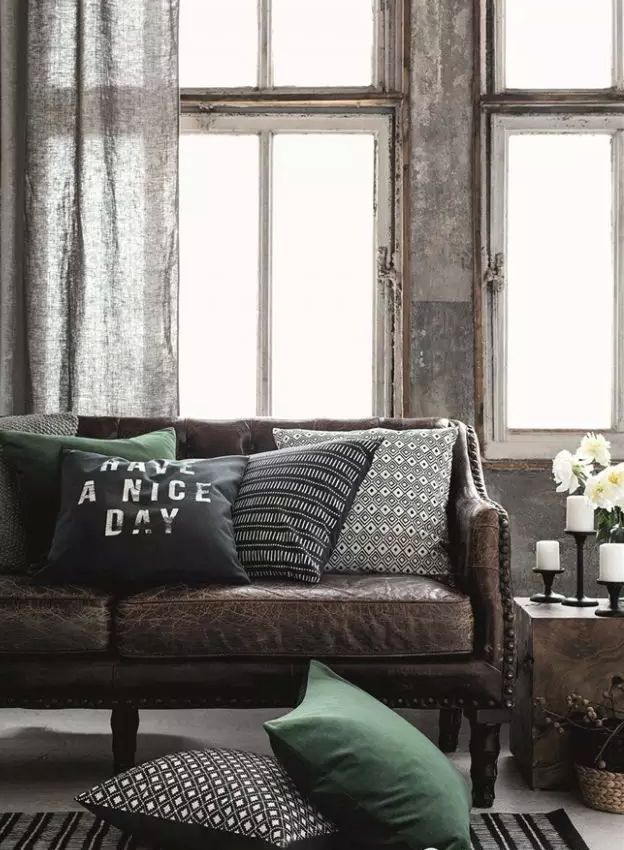 斑驳的窗棂、复古的铆钉沙发、原始的水泥地面,这个客厅空间散发着岁月感的气息。一块黑白条纹地毯和几个设计感突出的靠包就能瞬间提升客厅时尚感,绿色的靠包是点睛的关键。