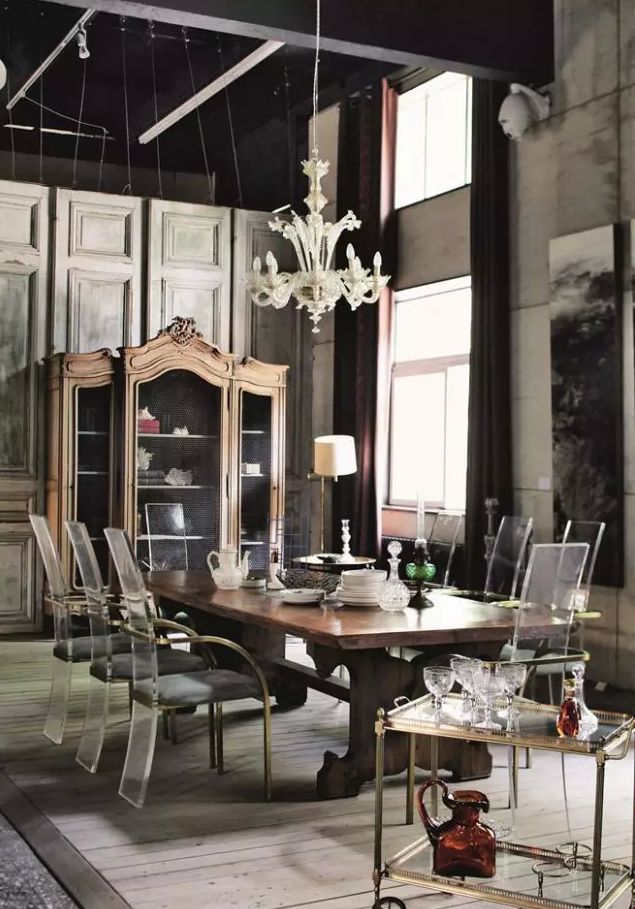桌腿的造型、柜顶的雕花,让原本厚重的古董家具变得轻盈而雅致了起来。水晶吊灯、水晶和金属搭配的餐椅、线条轻盈而考究的金属推车,让岁月感的画面更多了精致的看点。