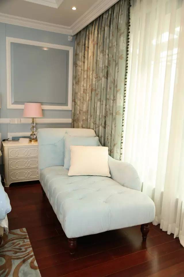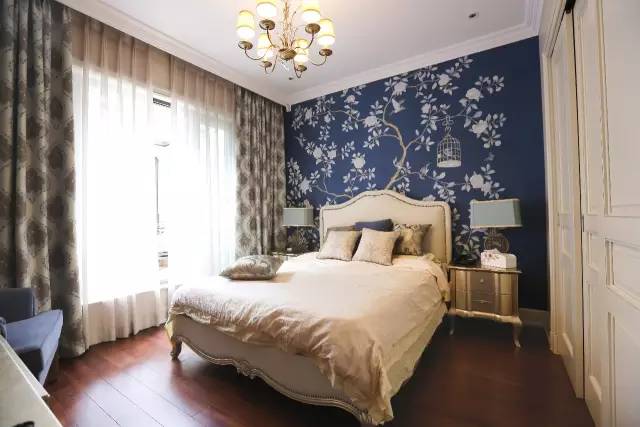 主卧空间:主卧的面积比较大,设计师把原本呆板的四面墙纸中的一面改为了护墙板,色调为蓝色,和衣柜、床头柜和灯罩的色彩做了协调,让整个空间明亮起来。