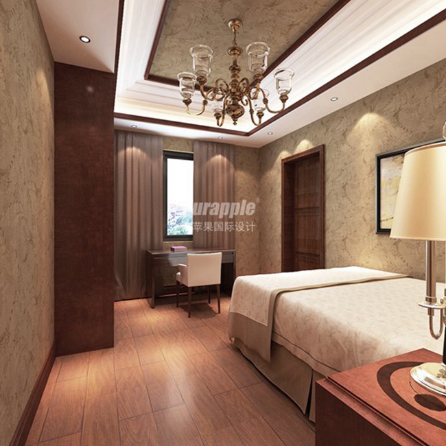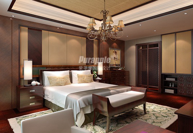 主卧室可选用深木色,金色丝制布料结合光线的变化,创造出内敛谦卑的感觉。